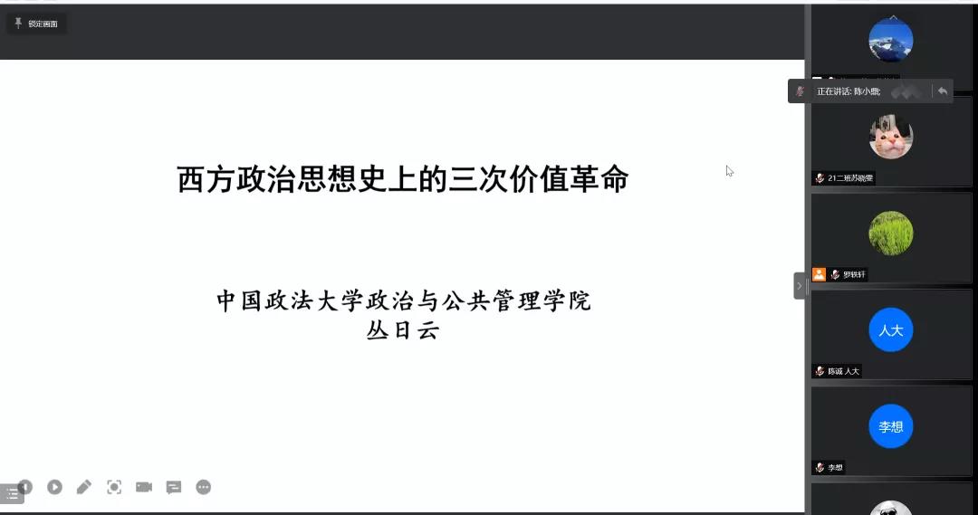 丛老师对西方政治思想史的三次价值革命及其表现所进行的阐述,使同学们深受启发。对于整体主义与个人主义及其历史演变,有了更深入的理解。同时获得了理解西方政治思想的一个新的视角。大家被丛老师认真严谨的态度和渊博的学识所折服。