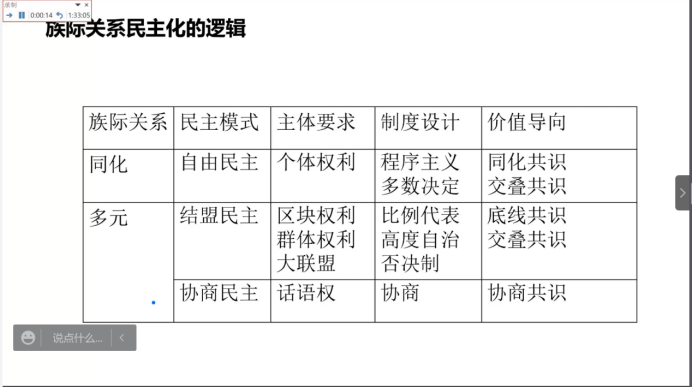 之后,佟教授指出,西方主流民主模式,即自由民主、结盟民主和协商民主三种模式在主体要求、制度设计和价值导向等层面存在差异,具体表现为个体权利与群体权利、多数制与比例制、同化共识、交叠共识、协商共识等多方面。族际冲突愈演愈烈,受到族际关系影响的民主越来越强调对族际关系的重视。总体来看,当代西方族际关系的主流开始从同化转向多元。