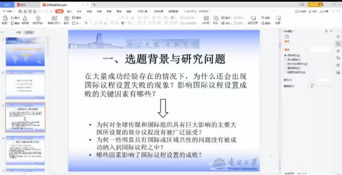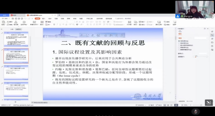 首先,杨娜教授介绍选题背景与研究问题。大量成功经验存在的情况下,为什么还会出现国际议程设置失败的现象?影响国际议程设置成败的关键因素有哪些?在此基础上,杨老师提出三个问题,一是为何对全球传媒和国际组织具有巨大影响的主要大国所设置的部分议程没有被广泛接受;二是为何一些明显具有国际或区域共性的问题没有被成功纳入到国际议程之中;三是哪些因素影响了国际议程设置的成败。