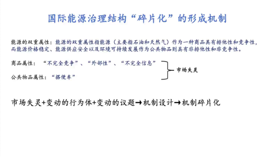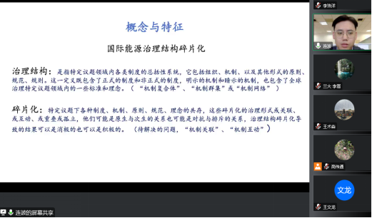接着,连波老师讲解了国际能源治理结构碎片化的相关内容。他在分析“治理结构”、“碎片化”等概念及特征后,进一步阐述了国际能源治理结构“碎片化”的形成机制。具体而言,能源作为一种商品具有排他性和竞争性的特点,而能源价格稳定、能源供应安全以及环境可持续发展作为公共物品则具有非排他性和非竞争性的特点,能源的双重属性导致了市场失灵现象;七大石油公司、石油输出国组织(OPEC)、国际能源署(IEA)、能源署外的新消费者构成了变动的行为体。市场失灵、变动的行为体以及变动的议题共同导致国际能源治理机制不断涌现,并最终形成机制的碎片化。连波老师强调,机制碎片化是一个中性的概念,是对当前能源治理机制情况的客观性呈现,其本身既可能产生积极的影响,也可能产生消极的影响。此外,连波老师还对石油、天然气的定价问题进行简要说明。