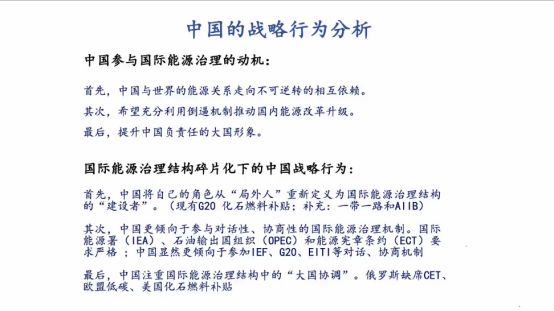 最后,连波老师分析了中国参与国际能源治理的动机,并诠释了国际能源治理结构碎片化下中国的战略选择和行为。连波老师认为,中国与世界的能源关系走向不可逆转的相互依赖,中国希望充分利用倒逼机制推动国内能源改革升级,同时提升中国负责任的大国形象。具体而言,中国将自己的角色从“局外人”重新定义为国际能源治理结构的“建设者”。同时,中国更加倾向于参与对话性、协商性的国际能源治理机制,如IEF、G20、EITI等机制,并更加注重国际能源治理结构中的“大国协调”。