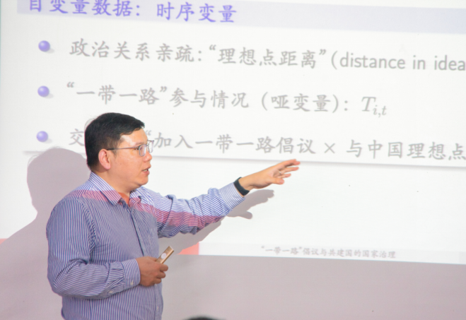 接着,陈老师深入讲解了此项研究的设计方案。他指出,基于各个国家加入“一带一路”时间点的差异性,该项研究创建了一个时间跨度为2014—2020年、包含195个国家的面板数据集,以“国家——年”作为分析单位,用“理想点距离”和“一带一路”参与情况作为自变量,采取“政府责任感”和“清廉(腐败)程度”两个指标作为因变量,选择“人均GDP”和“GDP增长率”、“政体类型”、“中国出口占比”和“中国进口占比”作为控制变量综合测量国家治理绩效。同时,该项研究采用固定效应模型、混合效应模型、匹配与双重差分结合方法以及因果调节效应分析来确保研究结论的稳健型。另外,该项研究还进行了一系列稳健型检验。