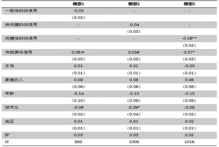 在得到图一的中介模型之前,我们首先将政治机构的信任建模为一般社交网络使用的函数(模型1)以及非政治和关键政治社交网络使用的函数(模型2);这两个模型都控制传统媒体的使用、性别、家庭收入、年龄、城市和地区。我们预计这两种情况都不会对社交媒体产生重大影响,因为作者的论点是,社交媒体对政治信任的影响及其最终对抗议的影响,取决于对关键/持不同政见者信息流的接触程度。模型3对此进行了测试;它在图一的中介模型的阶段1中表示。如果不信任在很大程度上源于关键的信息流,那么我们应该期待在这里产生的影响是显著和强烈的。