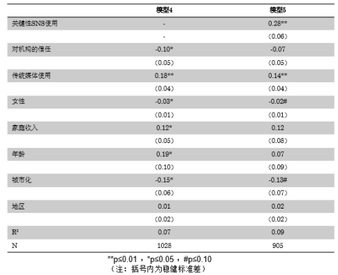 其次是两种抗议行为模式(模型4和模型5)。第一种是政治抗议行为模型,只包括对政治机构的信任和模型3规范中的相同控制,不包括关键的社交网络使用(模型4)。模型5完成了中介模型的循环(图1中的阶段2);它复制了模型4,但引入了关键社交网站的使用。毫无疑问,制度上的不信任会成为人们抗议的一个原因。如果导致不信任的大部分信息确实来自关键社交网站的使用,那么信任和抗议之间的关系可能很大程度上是由关键社交网站暴露所驱动的。如果图一中的理论模型是准确的,我们预计在模型4中对政治机构的信任是抗议行为的可靠预测因子,而在模型5中则不是。换言之,对政治机构的信任对抗议行为的影响将通过关键社交网络的使用来调节。从本质上讲,这将表明,由信任引起的抗议行为的差异,可以解释为对社交媒体流动的关键数字信息的接触差异。