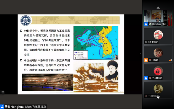 最后,门教授提出目前中日关系处于历史性重构期,中国应该牢记历史,谋划未来,坚持和平发展。门教授就如何应对中日战略相持问题作出解答,他分别从中国、日本与中日双方三个角度分析了中国应对中日关系的变化的合理做法。在提问环节,门教授对同学们提出的问题进行详细解答,并与兰州大学中亚研究所所长杨恕教授展开线上交流讨论。至此,活动圆满结束。