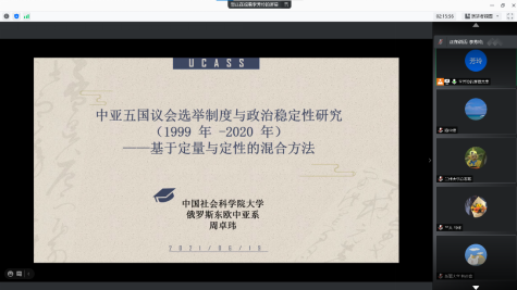 开幕式后,论坛分为“中亚问题研究”、“俄罗斯东欧问题研究”、“上合组织与地区问题”三个分论坛同步进行。在“中亚问题研究”分论坛中,李芳玲、石越洋、韩彦雄、张彤彤、陶安杰、连丹丹、叶玉虎、尉锦波、刘奇、周卓玮等同学以“美国国际开发署对中亚五国援助实践分析——动机、过程及其影响”、“中国与乌兹别克斯坦非传统安全合作的驱动因素”、“命运共同体视阈下中吉抗疫合作分析”“中国对中亚国家援助动机与效果分析——基于点-轴理论的视角”、“扎帕洛夫时期吉尔吉斯斯坦政治转型分析”、“吉尔吉斯斯坦反对派”“20世纪初苏联引进美国工程师进行中亚灌溉工程建设的研究”、“吉尔吉斯斯坦为何反复爆发‘革命’?——基于与乌兹别克斯坦的比较”、“哈萨克斯坦人道主义救援行动‘茹桑’:成效与困境”、“中亚五国议会选举制度与政治稳定性研究(1999-2020年)——基于定量与定性的混合方法”为题宣读了论文。兰州大学中亚研究所、博88亚洲