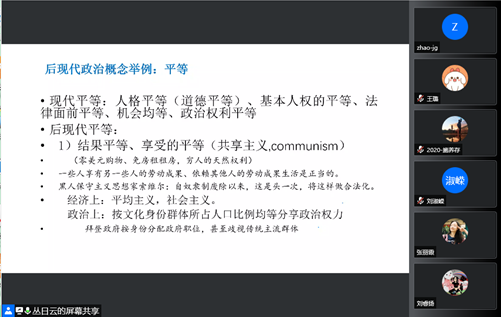 接着,丛老师将从现代文明向后现代文明转变作为分析当代西方政治的一个框架,并从五个方面展开了论述。第一,对现代主义价值革命与西方文明的转型的分析。丛老师进一步发展了现代文明转型理论,他认为由现代的个人主义价值观向后现代的自我表现价值观的转变是根本;第二,对后现代文明症候群的阐释。丛老师提出后现代诸多政治概念都发生了巨大的变化,自由、平等、民主、多元主义等,都被左派赋予了后现代的内涵。比如平等,就有了结果均等、共享主义、按文化身份所占人口比例分配权力、以结果反推过程等涵义,以至于出现反向歧视的结果。同时,政治议题、政治冲突、选民和政党重组,都反应了现代主义与后现代主义的斗争;第三,后现代主义是西方文明败坏性因子。丛老师认为人口结构的迅速改变带来文明主体的转换,使得“西方世界正在走向一场自发形成的种族灭绝灾难”;第四,对西方文明自杀倾向的根源的系统分析;最后,当代保守主义的使命是维护现代文明基本价值,抵制后现代主义。至此,本次讲座圆满结束。