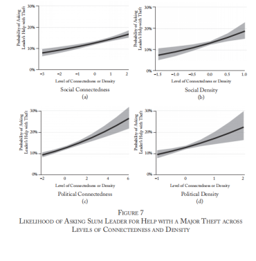 作者的检验结果支持如下结论,社会联系密集的公民和贫民窟与警察有更好的关系,因为他们可以接触到社区领导人。这两个连通性(即个体水平)变量和密度(即贫民窟水平)都是正相关的且不显著(表4)。其影响是巨大的(图7),在某些情况下,使贫民窟居民寻求领导人帮助解决重大盗窃案的可能性增加了一倍甚至三倍。