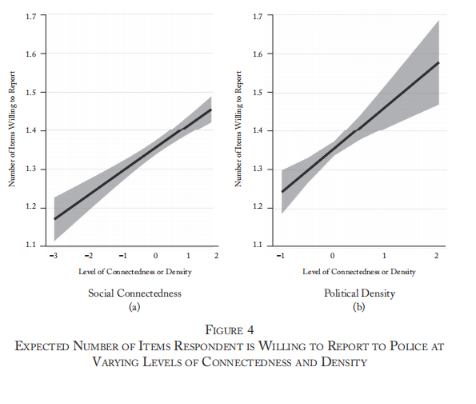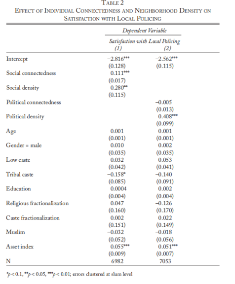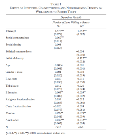 个人网络位置和社区网络密度都与警察接触的意愿(例如,向他们报告失窃状况的意愿)、贿赂警察的预期成本以及对警察的总体满意度有关。同时发现,这些结果并不是更网络化的社区经历更少冲突的结果,而是这些社区更有可能在与警察互动时依赖政治调解人。作者的最后一项发现强调了政治调解在世界上许多穷人与国家正式机构互动方面的重要作用。