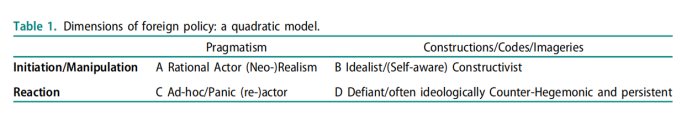 因此,与其持有严格的现实主义与理想主义/建构主义的二元视角,不如在分析各国的外交政策时,实施多维度、包容性的“地缘政治推理”。这是因为“地缘政治推理”不仅关注地理战略因素,还关注文化因素和(历史建构的)价值观。这种类型的地缘政治推理和分析普遍存在的地理传统考虑多维度和多层次分析,而(新)古典地缘政治主要是以国家为中心的传统,经常与国际关系的(新)现实主义传统重叠。由于地缘政治方法在分析一个国家的外交政策时同时考虑了持续的信念和实际的战略,因此上述的二维理论模型可能是这种地缘政治分析的有用工具。