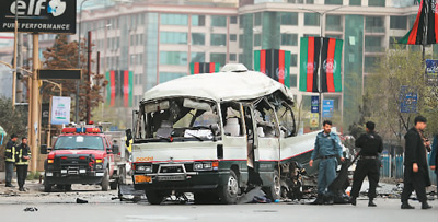 阿富汗警方3月15日称,首都喀布尔一辆汽车遭到炸弹袭击,造成至少15人受伤。图为当天阿富汗安全人员检查喀布尔的袭击现场。