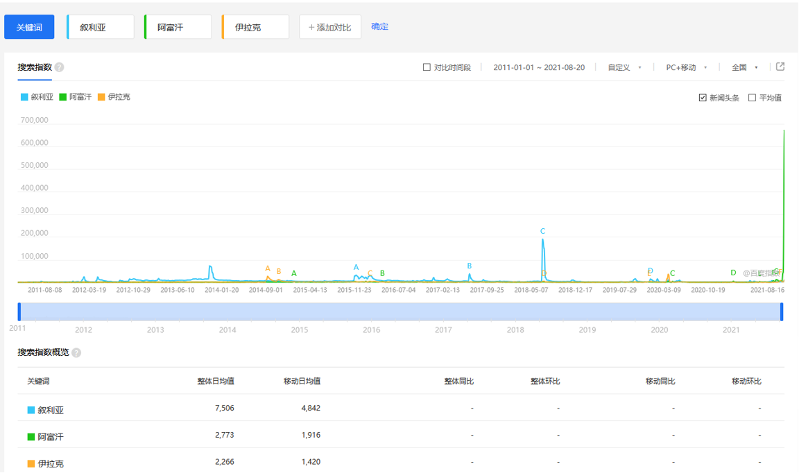 另外我做了一个百度指数还有谷歌指数趋势的一个对比。在百度指数里同时检索叙利亚、阿富汗和伊拉克这三个关键词,不同时期三个关键词的关注度是不太一样的,叙利亚排第一,整体的日均值和移动端的日均值都是处在第一位,阿富汗处在第二位,伊拉克处在第三位,时间的维度我选在了2011年到大前天(2021年8月21日)。这说明,我们对叙利亚问题的关注度远大于阿富汗。叙利亚离我们相对来说还是比较遥远,不像阿富汗是我们的一个邻国,但是大家对叙利亚的关注度,在过去一直比阿富汗高,只不过是最近这段时间阿富汗才引起了大家的注意,因为阿富汗局势出现了重大的变化。