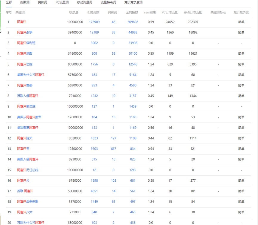 同时我们来看一下中国人对阿富汗的认知。我做了一个百度网站指数关键词的挖掘。大家可以看到,中国人搜的最多的20个关于阿富汗的关键词,第一个是阿富汗,第二个是阿富汗战争,第三个是阿富汗塔利班,接下来就是阿富汗地图、阿富汗总统、美国为什么打阿富汗、阿富汗的首都……这反映出很多人可能还不太清楚阿富汗的首都在哪,所以需要通过检索来核实一下。这些关键词的检索,事实上反映出中国人对阿富汗问题的兴趣。