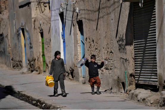 在阿富汗喀布尔,孩子们拿着空的容器准备去水井打水。新华社发