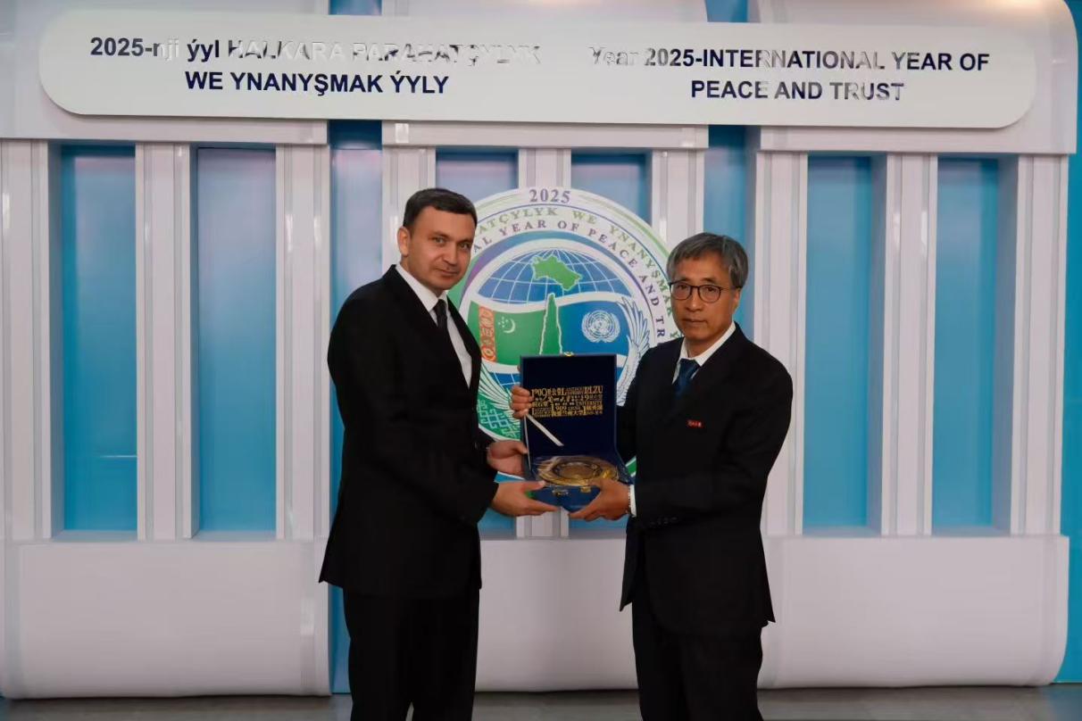 代表团向土库曼斯坦外交部国际关系学院赠送兰州大学纪念盘