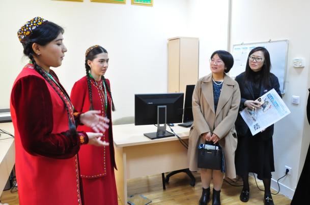 代表团还实地考察了土库曼斯坦外交博物馆以及土库曼斯坦外交部国际关系学院图书馆、德语图书室、新媒体中心、与联合国合作发展成果展览室、印度及土耳其文化角、学生宿舍、体育馆等教学科研及生活设施,并走进学生课堂,与师生开展交流。