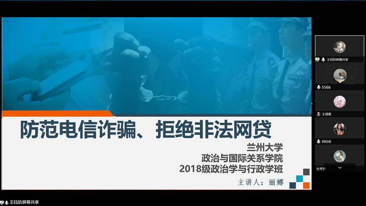 6月26日2019级政治学类2班防诈骗主题班会在线上召开。首先班会集体学习《2019年网络诈骗研究报告》,介绍了诈骗活动对大学生造成的危害,并列举了三个事例,让同学们深切体会到诈骗活动的危害,并让大家认识到诈骗活动一直离我们很近;第二部分是日常生活中的防诈骗技巧。会上分析了被诈骗的主要原因,有社会经验不足,防范意识淡薄;法律意识相对淡薄;虚荣心、攀比心作崇三个原因。最后,再次提醒同学们警惕网络诈骗。