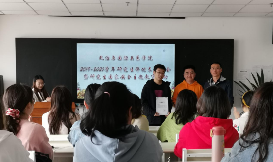首先,党委副书记贾海燕老师宣读2019—2020学年研究生评优名单,并为2021届甘肃省普通高校优秀毕业生、兰州大学优秀毕业生李琳琳同学,优秀研究生标兵赵磊同学,优秀研究生曹佳鲁、魏宸宇同学,优秀研究生干部王文杰同学颁奖。之后,贾海燕老师宣布研究生优秀班级和研究生文明宿舍名单,并由2019级国际政治硕士研究生班班长及2018级女生513宿舍代表上台领奖。