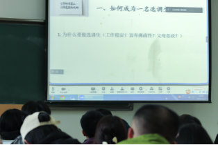 武汉大学博士杨老师分享了福建省选调生的经历。他分别从选调生政策、选调生日常工作以及对职业选择的建议三方面展开,建议同学们在备考时主动关注地域人才政策、重视实习工作积累、衡量自身能力与岗位要求。同时,杨老师还提醒同学们早思考、早打算,做好准备,在选定职业方向后就要坚定个人目标,踏实做事。