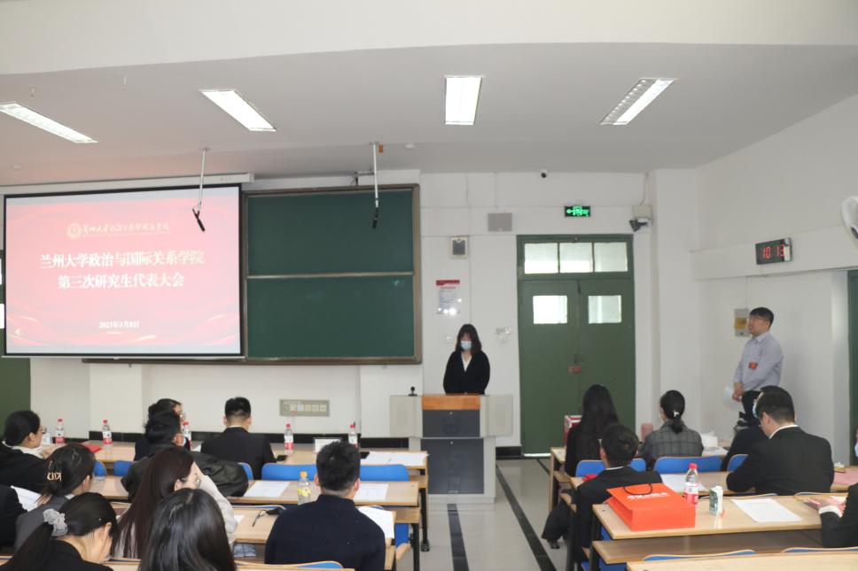 第三次研究生代表大会在兰州大学城关校区杏林楼A 区四教隆重召开。学院党委副书记贾海燕老师、校研究生会主席团成员禄润卿、管理学院研究生会主席团成员丁铭以及第三次研究生代表大会全体代表、工作人员出席大会。大会由秘书长雷环瑞老师主持。
