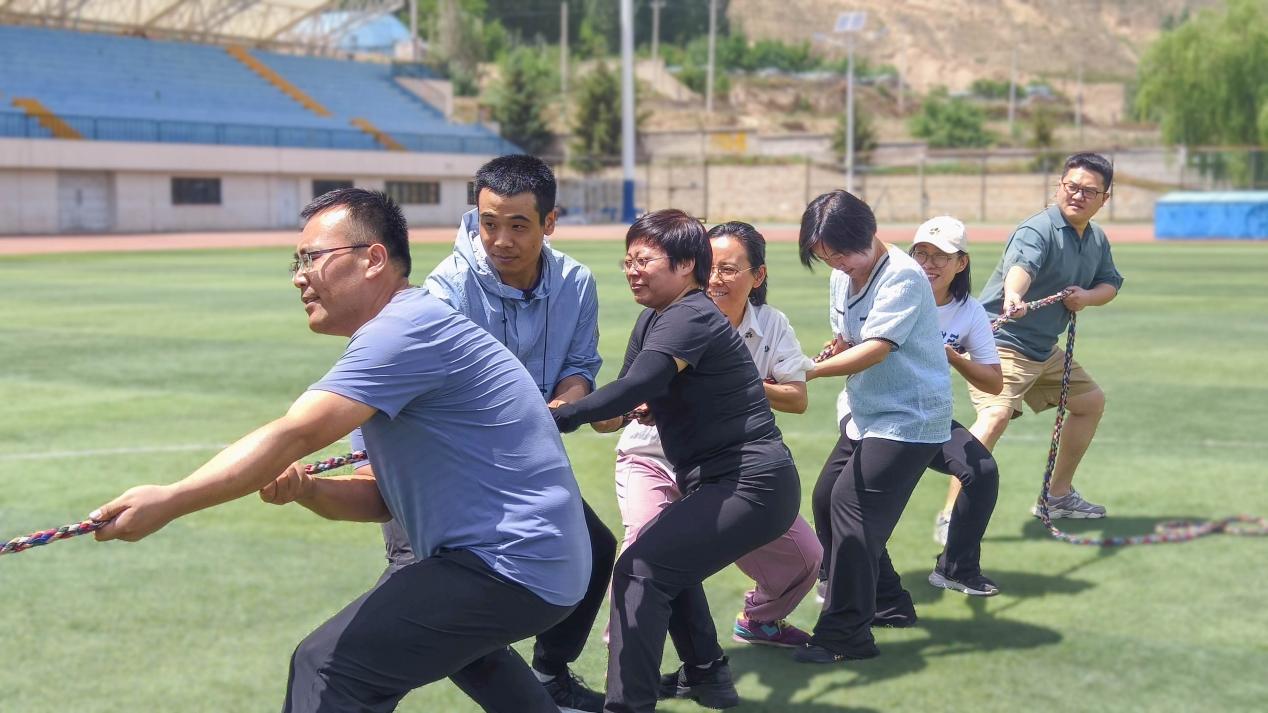 古有“力拔山兮气盖世”,今有“力,拔河兮,气盖我校西方”。夫子曰:“有朋自远方来,不亦说乎?”有一观众笑言:“有绳自对面来,不亦拔乎?”拔河者曰:“当拔!”只见那裁判甫一令下,师生便各执绳一端用劲拔起来,喊声震天响、热火朝天,一时间双方僵持不下、伯仲难分。