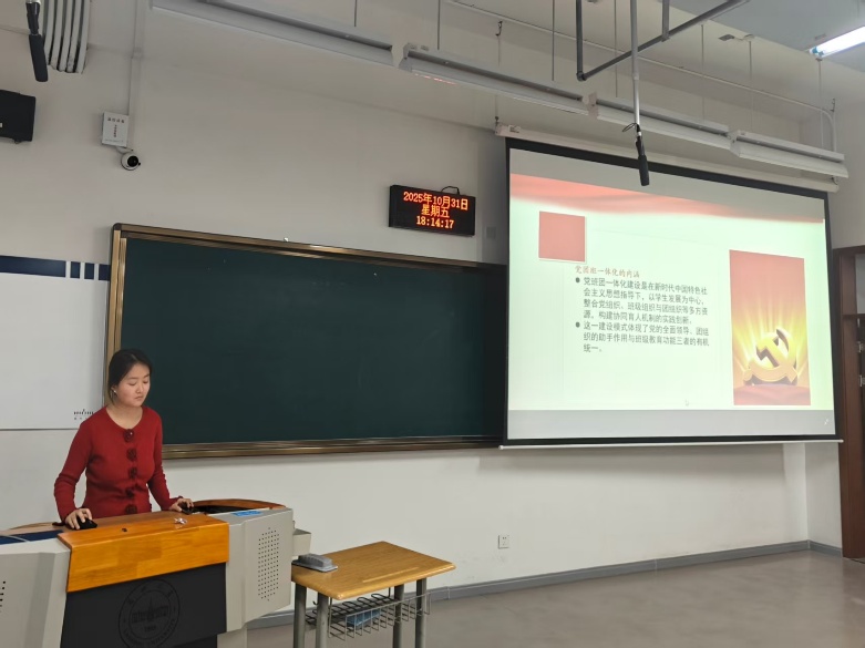 随后,黄艳进一步强调了党团班一体化的重要意义。首先,通过党组织的政治引领、班级组织的具体实践和团组织的文化桥梁作用,党班团一体化建设将思想政治教育深入到日常教学、班级管理及社会实践等环节,从而强化校园思想政治工作,培养学生的社会责任感与创新能力,推动学生的全面发展;其次,有助于推动党组织、团组织与班级组织的深度协作,通过明确各组织的职责与分工,并优化工作流程与信息流通,党班团一体化建设能够提升组织效能;最后,党班团一体化建设通过组织结构的协同配合,在学生群体中能够形成良好的集体氛围,培养学生的社会责任感,促进集体主义精神的培养,增强社会责任感。