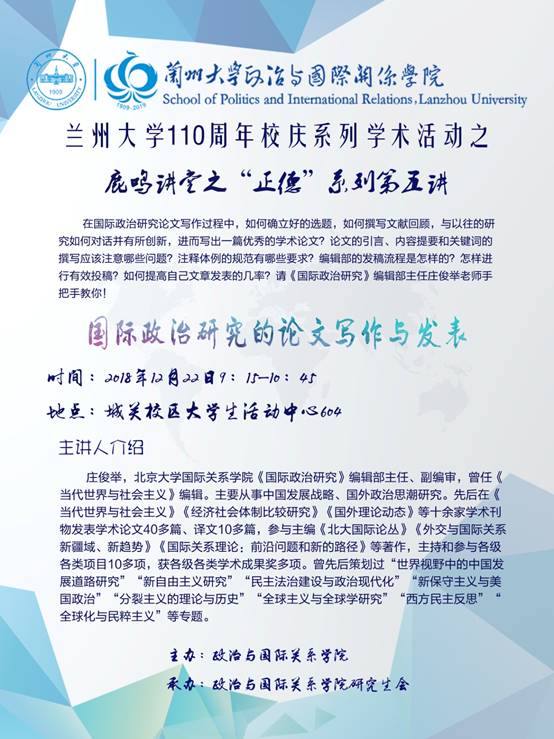 应博88亚洲 邀请,北京大学国际关系学院《国际政治研究》编辑部主任、副编审庄俊举老师于2018年12月22日来博88亚洲 进行学术交流并作讲座,欢迎广大师生届时参加。
