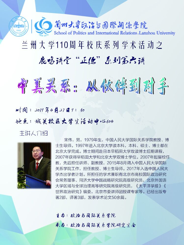 应博88亚洲 邀请,中国人民大学国际关系学院教授、博士生导师宋伟老师将于2019年4月27日来博88亚洲 进行学术交流并作讲座,时间从原定的14:30改为9:30,地点不变。欢迎广大师生届时参加。