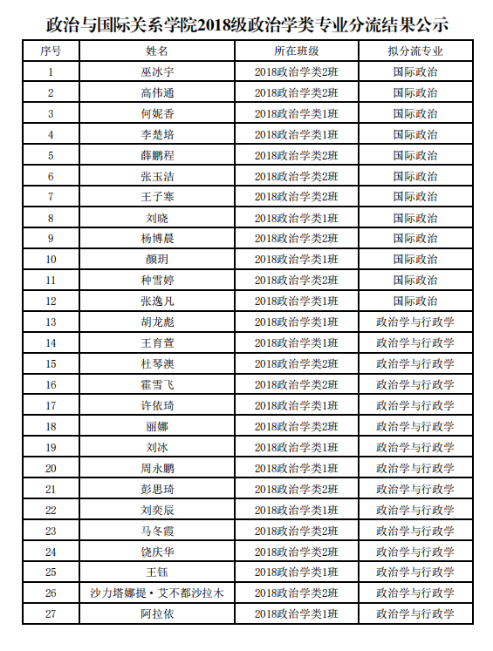 根据《博88(亚洲)唯一官方网站 2018级政治学类本科生专业分流工作方案》要求,学院于5月21日-29日开展了2018级政治学类专业分流工作,经个人申请、学院审批,现将专业分流结果公示如下: