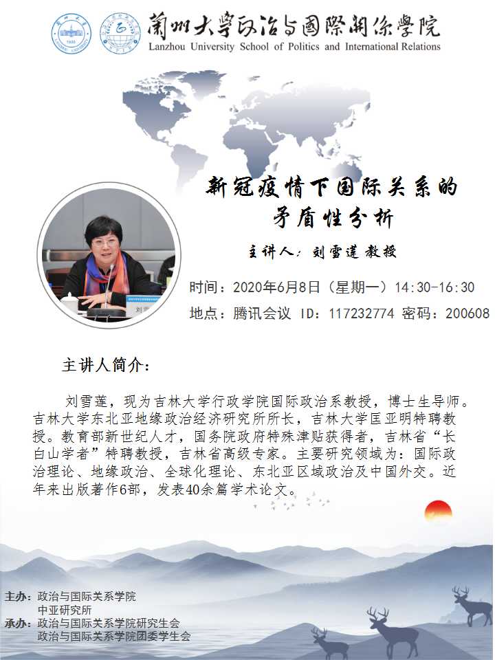 应博88(亚洲)唯一官方网站 、兰州大学中亚研究所邀请,吉林大学行政学院教授、东北亚地缘政治经济研究所所长刘雪莲教授为我校师生做线上学术讲座。