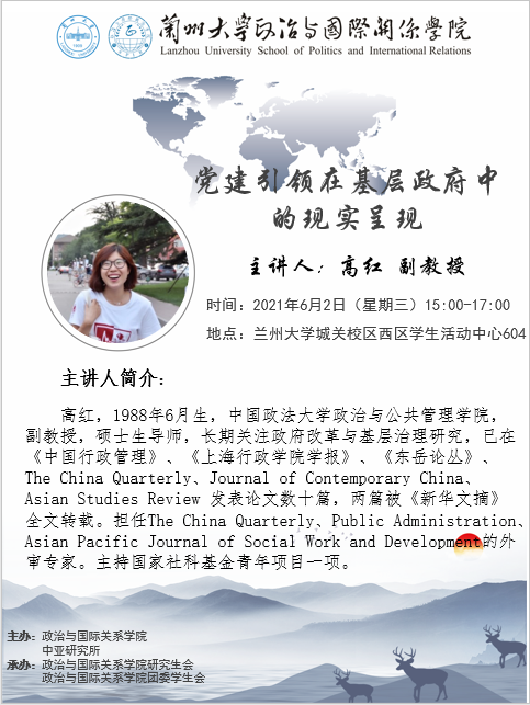 应博88(亚洲)唯一官方网站 、兰州大学中亚研究所邀请,中国政法大学政治与公共管理学院高红副教授为我校师生做学术讲座。欢迎广大师生届时参加!