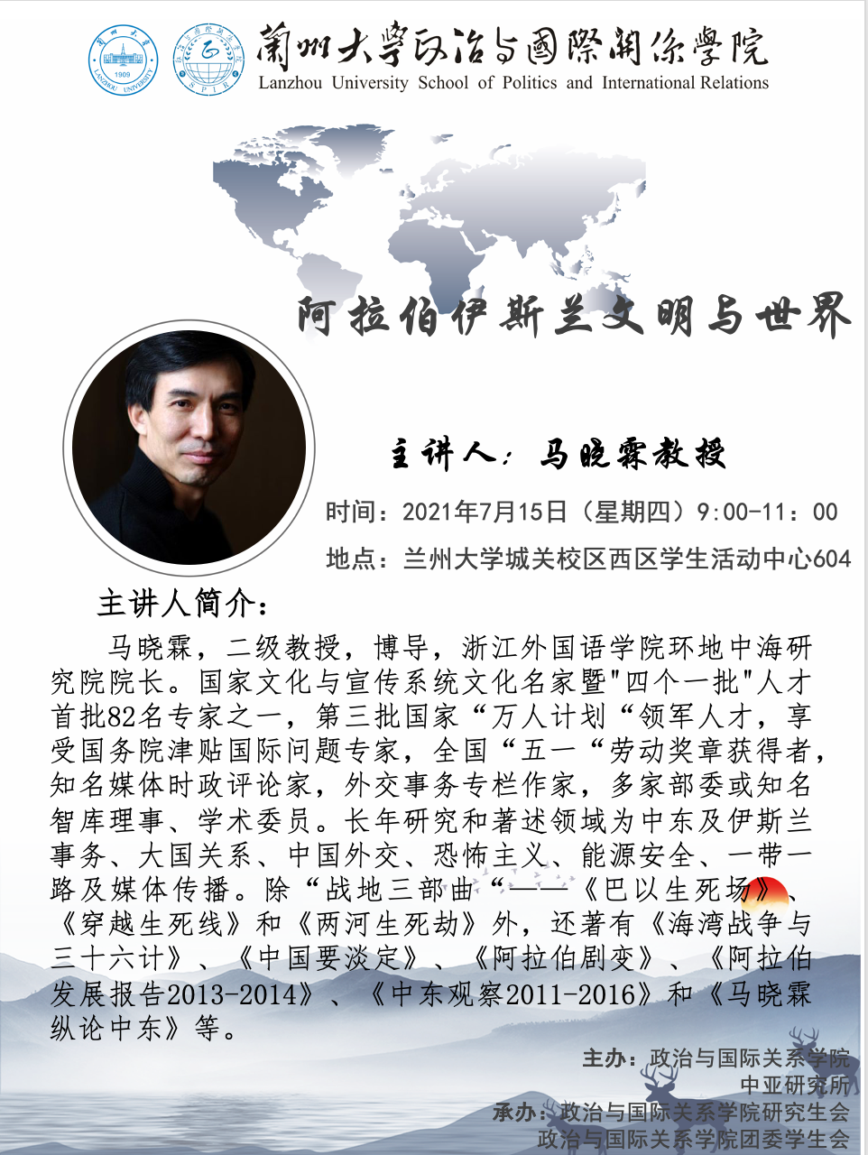 应博88(亚洲)唯一官方网站 、兰州大学中亚研究所邀请,浙江外国语学院环地中海研究院院长马晓霖教授为我校师生做学术讲座。欢迎广大师生届时参加!