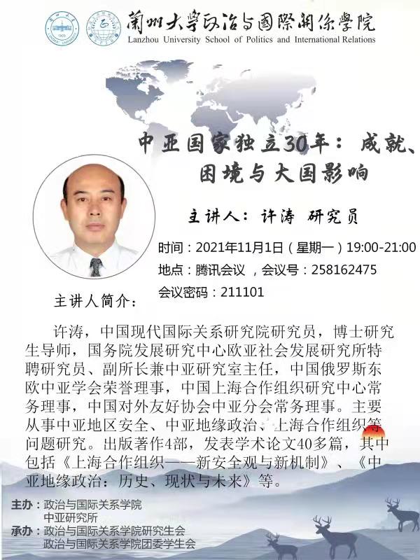 应博88(亚洲)唯一官方网站 、兰州大学中亚研究所邀请,中国现代国际关系研究院许涛研究员为我校师生做学术讲座。欢迎广大师生届时参加!