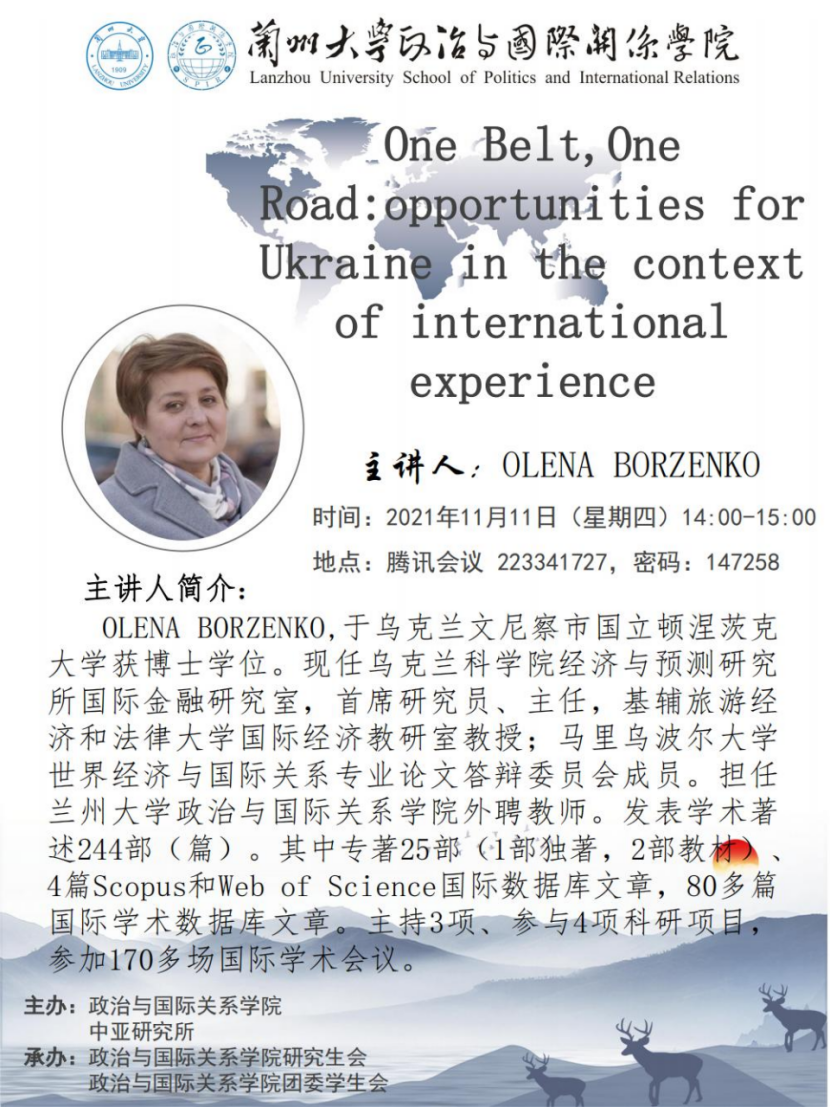 应博88(亚洲)唯一官方网站 、兰州大学中亚研究所邀请,乌克兰科学院经济与预测研究所研究员耶列那·波尔坚科为我校师生做学术讲座。欢迎广大师生届时参加。