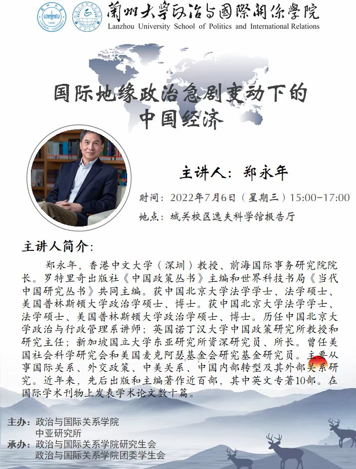 应博88(亚洲)唯一官方网站 、兰州大学中亚研究所邀请,香港中文大学(深圳)教授、前海国际事务研究院院长郑永年为我校师生做学术讲座。欢迎广大师生届时参加!