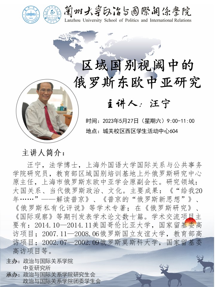 应博88(亚洲)唯一官方网站 、兰州大学中亚研究所邀请,上海外国语大学国际关系与公共事务学院研究员汪宁为我校师生做讲座。欢迎广大师生届时参加!