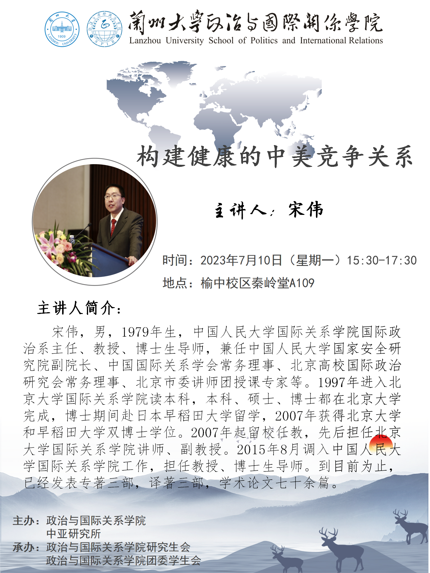 应博88(亚洲)唯一官方网站 、兰州大学中亚研究所邀请,中国人民大学国际关系学院国际政治系主任、教授、博士生导师宋伟为我校师生做讲座。欢迎广大师生届时参加!