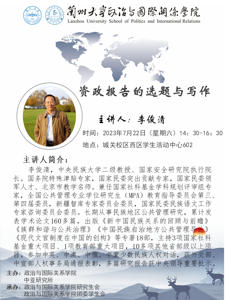 应博88(亚洲)唯一官方网站 、兰州大学中亚研究所邀请,李俊清,中央民族大学二级教授、国家安全研究院执行院长李俊清为我校师生做讲座。欢迎广大师生届时参加!