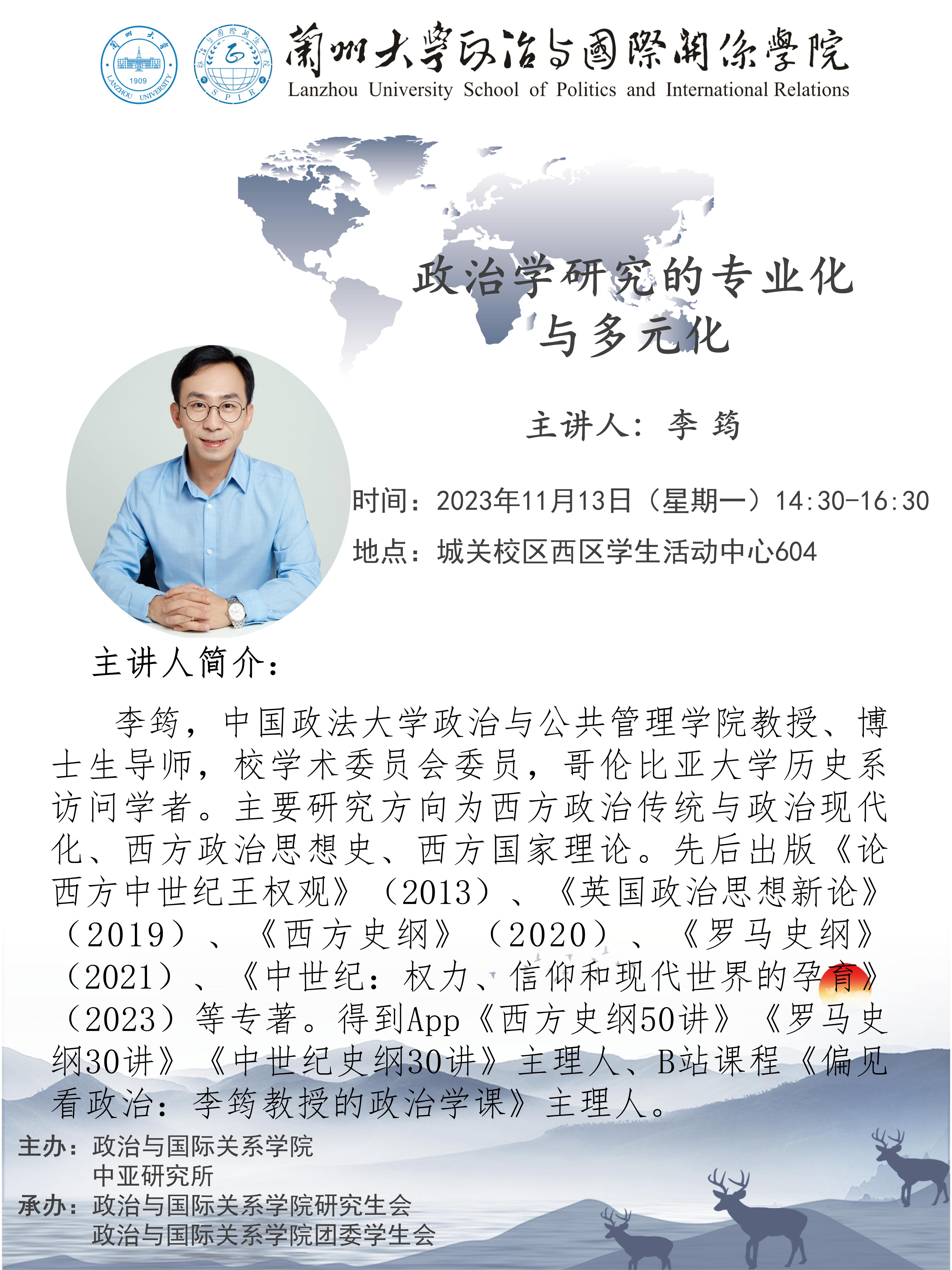 应博88(亚洲)唯一官方网站 、兰州大学中亚研究所邀请,中国政法大学政治与公共管理学院教授、博士生导师李筠为我校师生做讲座。欢迎广大师生届时参加。