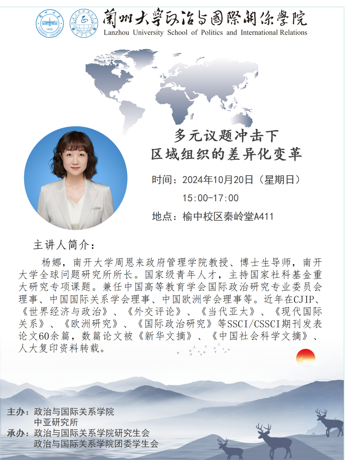 应博88(亚洲)唯一官方网站 、兰州大学中亚研究所邀请,南开大学周恩来政府管理学院教授、博士生导师杨娜为我校师生做讲座。欢迎广大师生届时参加!