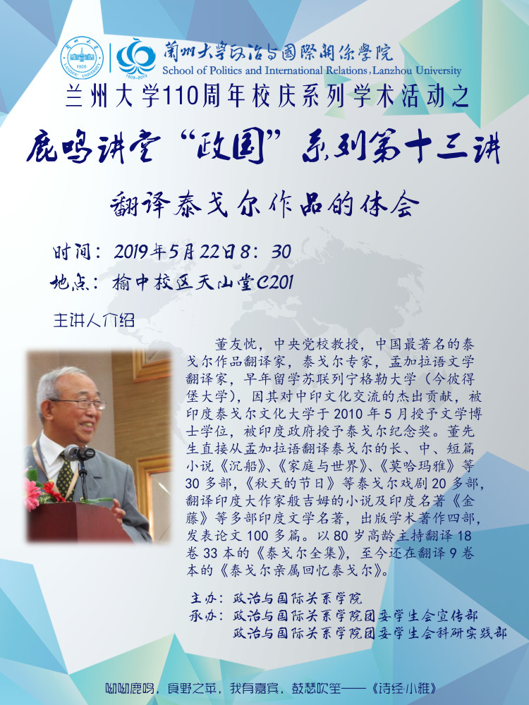 Invited by School of Politics and International Relations of Lanzhou University, Dong Youchen, Professor of Party School of the Central Committee of CPC, will hold an academic lecture in our School on May 22nd, 2019. All the teachers and students are welcome to attend.