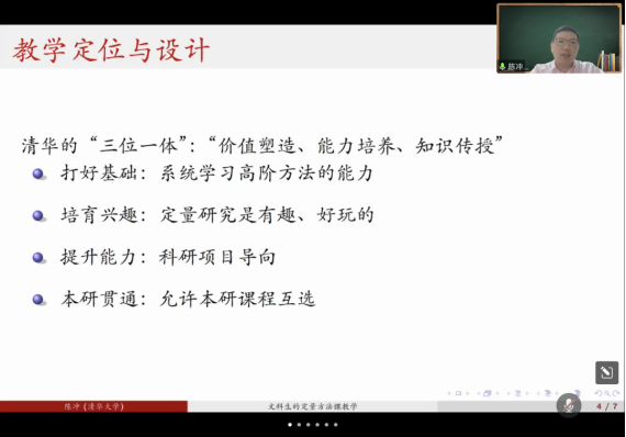 Mr. Chen Chong from the School of International Relations, Tsinghua University shared his views on "Teaching Quantitative Methods to Liberal Arts Students". Firstly, Mr. Chen introduced the orientation of the quantitative methods course. He first explained the importance and practicality of quantitative methods in terms of internship, research and study abroad. He then went on to explain how the quantitative statistics class can shape values, develop competencies and impart knowledge in terms of the cultivation of scientific spirit, the use of tools, the promotion of independent research projects and the selection of course materials. Next, Mr. Chen shared the teaching of quantitative methods lessons from the perspective of this research interchange. In specific teaching, Mr. Chen's quantitative methods course system encourages outstanding undergraduate students to take a graduate methods course, while requiring graduate students to take an undergraduate equivalent methods course first.