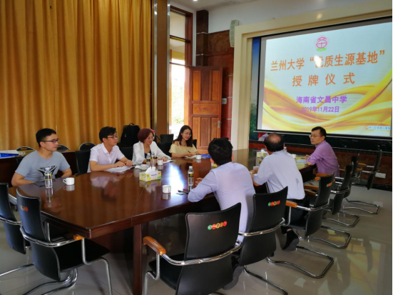 在文昌中学,招生宣传组与文昌中学校长进行了座谈。招生宣传组详细了解当地中学的生源、教学等情况。文昌中学潘正怀校长介绍了文昌中学的教育教学情况,潘校长表示希望双方能够加强校际合作,展开多种形式的交流活动,让文昌师生更多地了解兰州大学,同时也希望兰州大学的老师今后能够多到文昌中学来,举办更多高水平的讲座。